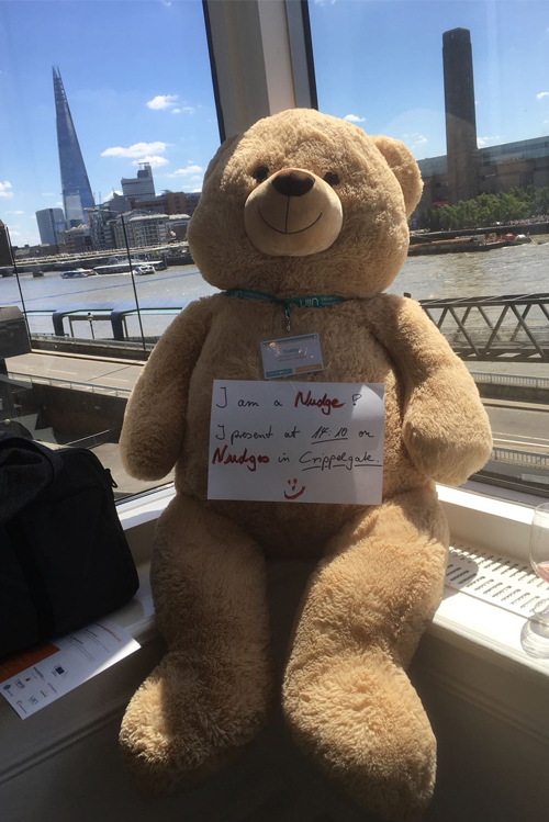 Co-Authors have been Marieke Baaken (Georg-August-Universität Göttingen, Faculty of Economic Sciences) and Sanae Okamoto (Maastricht University, Faculty of Psychology). Additionally Mr. Teddy served as mascot of the presentation and called himself a “nudge” to present in the respectable track. He managed to get more attendees into the track and motivated people to listen. A perfect example for a nudge.